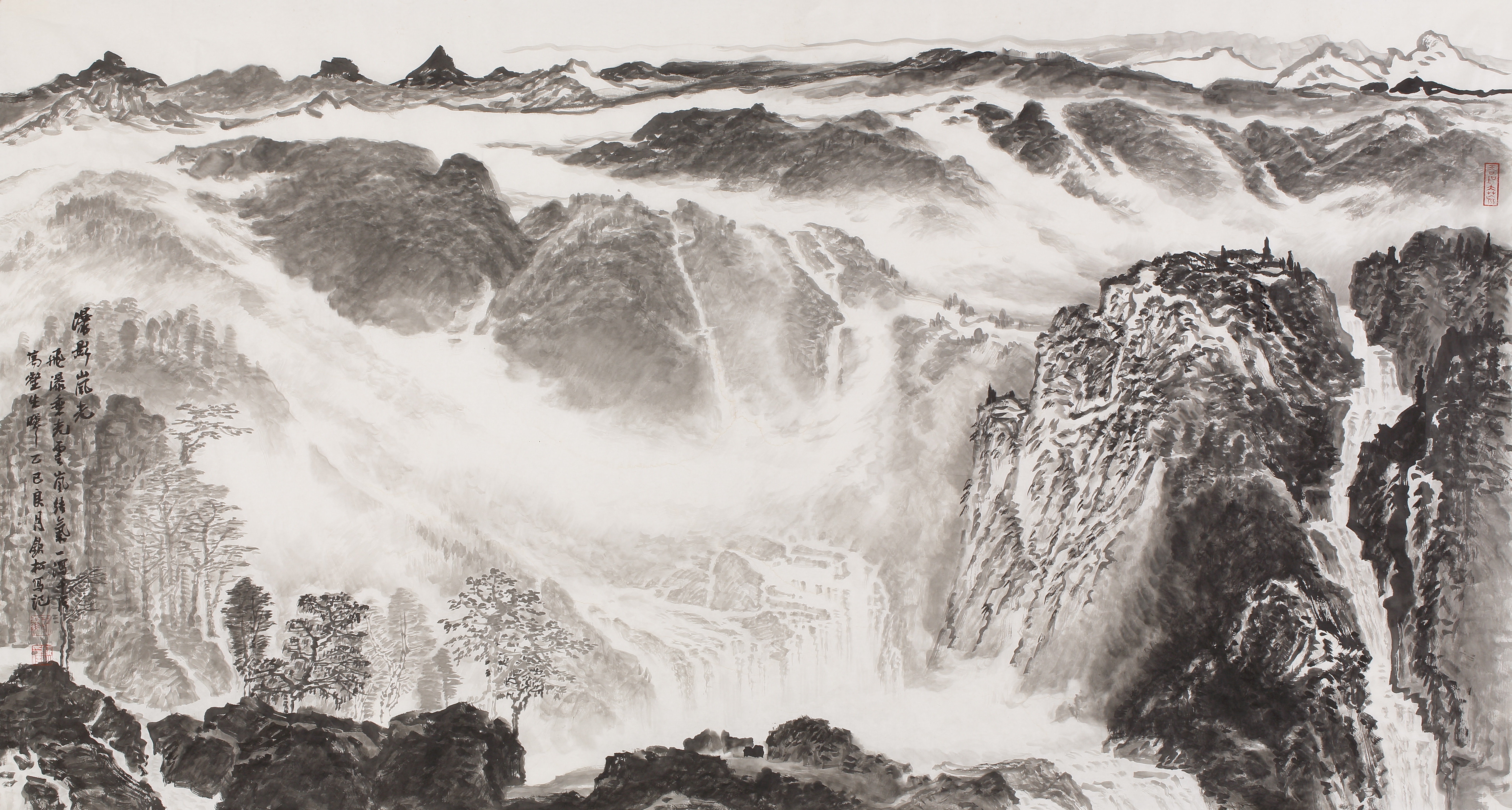 画面中,群峰叠嶂,云雾缭绕,瀑布飞流直下,岚光变幻莫测。许钦松以其独特的“重墨法”和“积墨积色法”,营造出山体的厚重质感与空间的深远层次。作品既保留了传统山水画的笔墨韵味,又融入了当代审美意识,体现了艺术家对自然精神的深刻理解和对时代美学的敏锐把握。