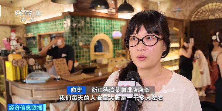 浙江德清某咖啡店店长 俞奥:国庆假期期间,我们每天的人流量是一千多人,比平时的话会多30%到40%,营业额会比平时多20%到30%。