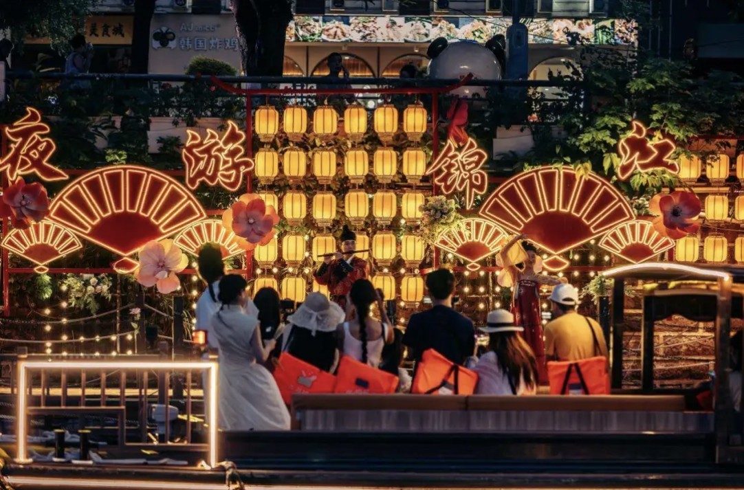 岸边的灯笼印着非遗元素,灯光倒映在锦江水面,波光粼粼。乘船夜游的话,还能从水上欣赏两岸风光——廊桥的飞檐挂着彩灯,晚风拂过面颊,带着淡淡的桂花香,耳边传来丝竹演奏的悠扬旋律,这一刻,时光都变得温柔又治愈。